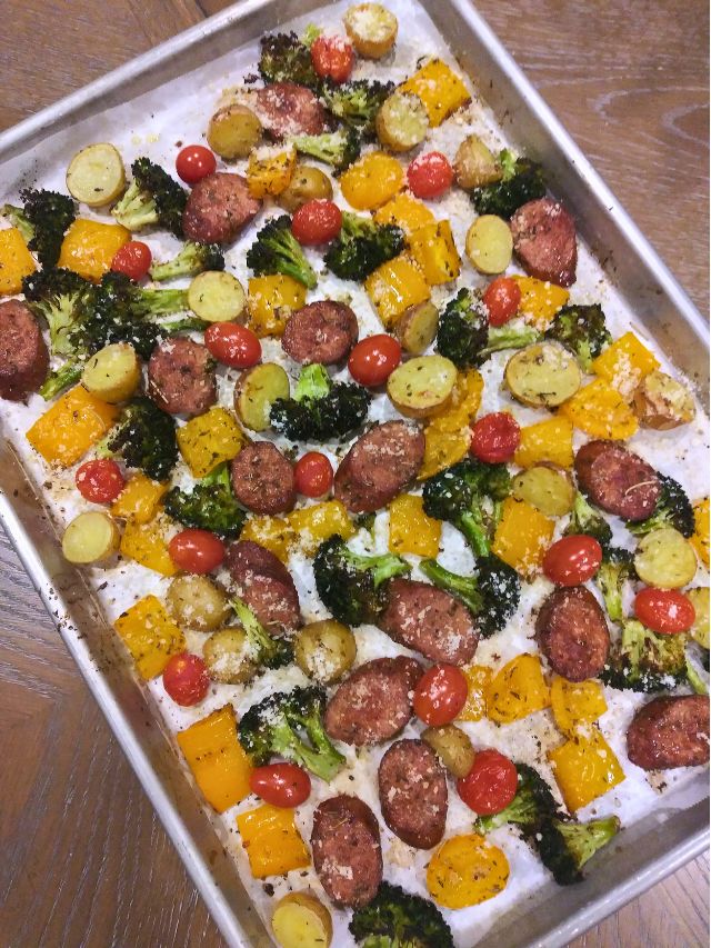 Prep these ingredients while you’re heating your oven to 400F: 1/2 pound of smoked sausage or kielbasa (peeled and cut into 1/2″ slices), 10-12 baby potatoes (cut in half), 1 large bell pepper (any color – cut into 1 inch pieces), 1 head of broccoli (cut into florets), and 1 cup of grape or cherry tomatoes.
