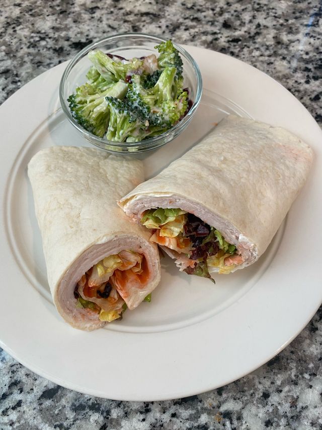 All you need is two large whole wheat or flour tortillas, jalapeño-flavored cream cheese (softened), smoked turkey (sliced, from the deli), shredded romaine or spring mix lettuce, and French dressing.