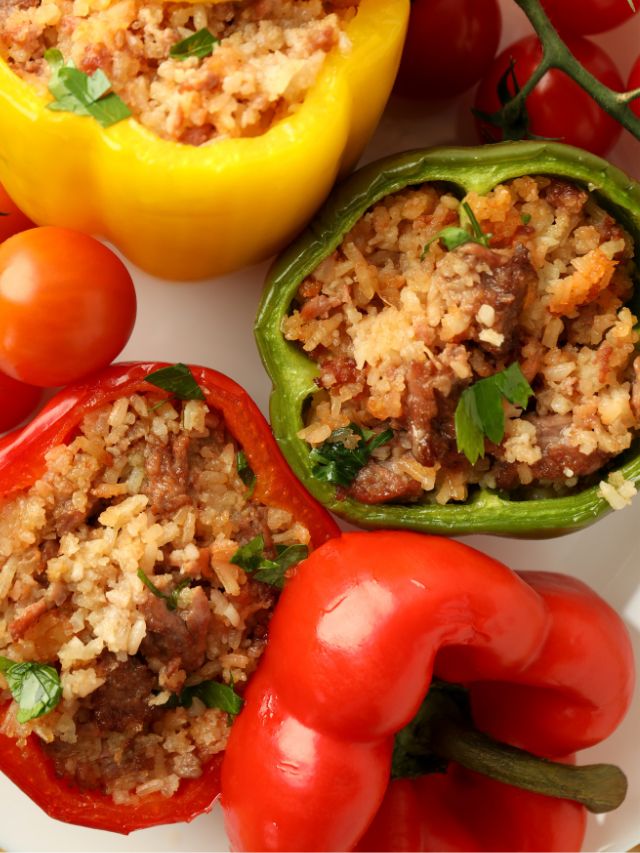 Preheat your oven to 325F. Cook the ground chicken and onion in a skillet; drain. Stir in the cooked rice and season to taste. (I like to use salt, pepper, and some Italian seasoning.) Cut the peppers in half lengthwise and remove the seeds. Place them in a 9 X 9″ baking dish sprayed with olive oil. Fill with the meat mixture, then pour the tomato sauce over stuffed peppers. Add about 1/4 cup of water to the pan, and bake for 60 minutes or until the peppers are tender.